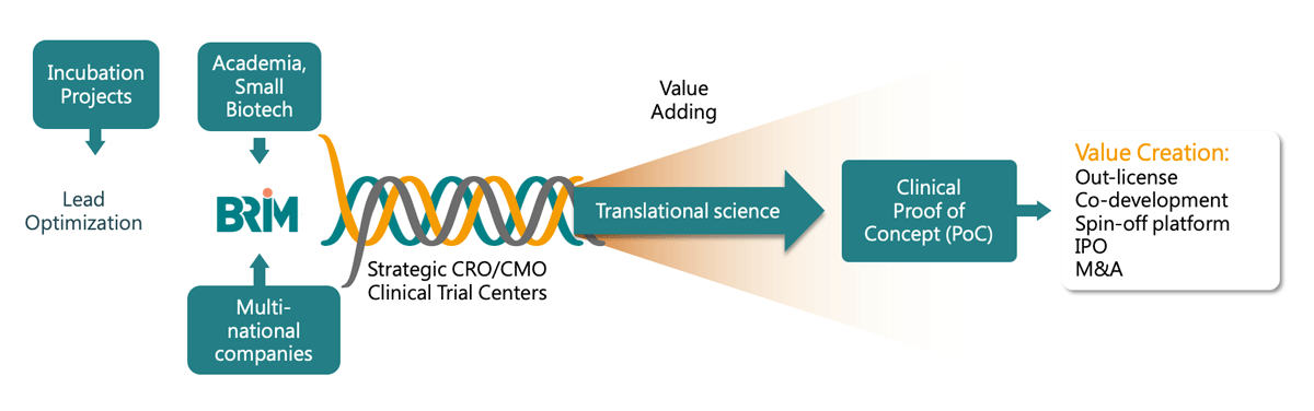 BRIM translates research into clinical assets with the highest potential to positively impact patient lives. BRIM primarily targets highly novel projects with new molecular entities and niche platforms, targeting diseases where there are unmet medical needs. This involves, in-licensing from, or partnering with, academic institutions and biotech or pharma companies, both locally and internationally.